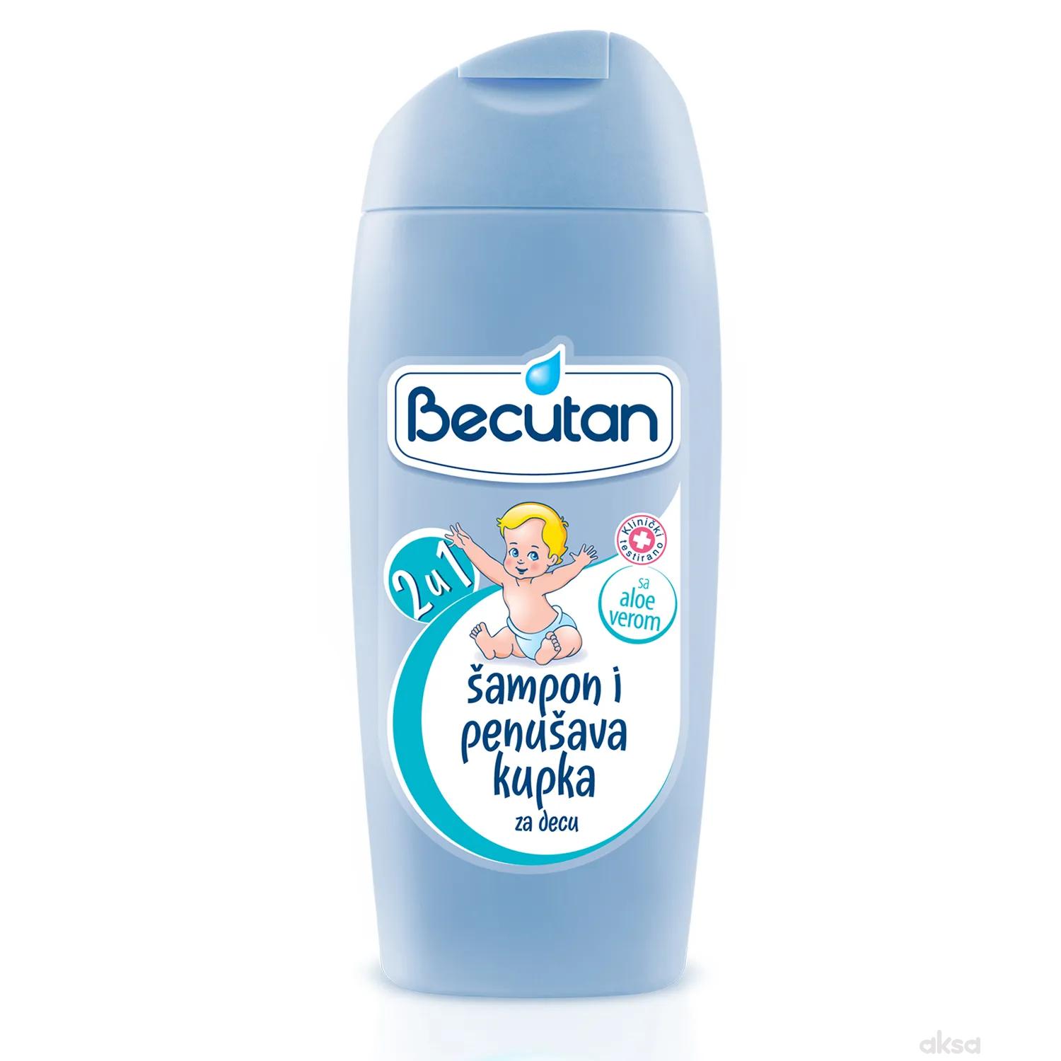 Becutan baby šampon i kupka 2 u 1 400ml je idealna kombinacija za njegu i higijenu dječije kože i kose u jednom koraku. Proizvod je klinički testiran i ima prilagođenu pH vrijednost. Sadrži glyceryl oleat prirodni sastojak koji doprinosi održavanju zaštitne funkcije bebine kože, aloe veru i ekstrakt pšeničnih klica. Ne sadrži sapun, alkohol ni parabene.Uzrast: 0m+.