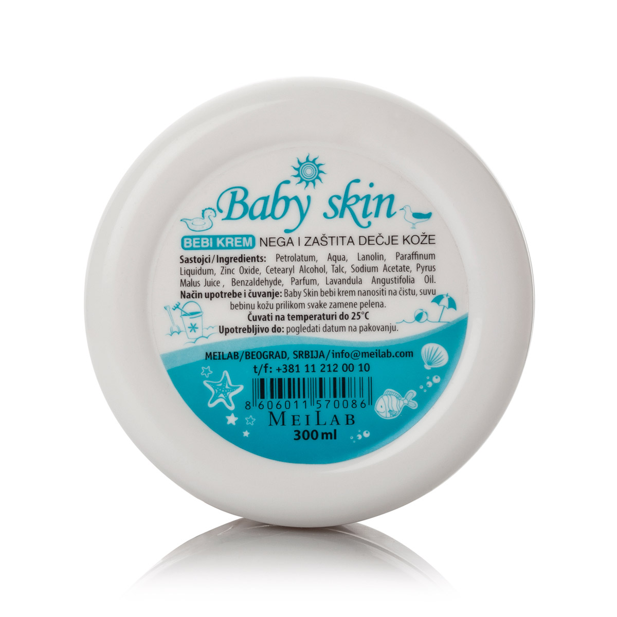Baby skin bebi krem je zaštitni krem za negu kože, koji u svom sastavu ima prirodne supstance koje štite i njeguju i najosetljiviju kožu beba. Baziran je na tradicionalnim saznanjima o emolijentnim svojstvima lanolina, koji se lako apsorbuje u kožu i održava njenu elastičnost i vlažnost. Istovremeno, sastav i formula krema je obogaćena poslednjim saznanjima o svojstvima i djelovanju više prirodnih supstanci, što je doprinijelo daljem povećanju njene zaštitne i njegovne funkcije.