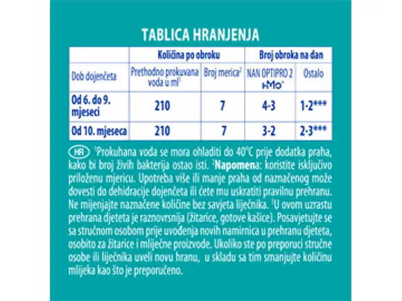 **Napomena: koristite isključivo priloženu mjericu. Upotreba više ili manje praha od naznačenog će dovesti do dehidracije dojenčeta ili ćete mu uskratiti pravilnu prehranu. Ne mijenjajte naznačene količine bez liječnikovog savjeta..